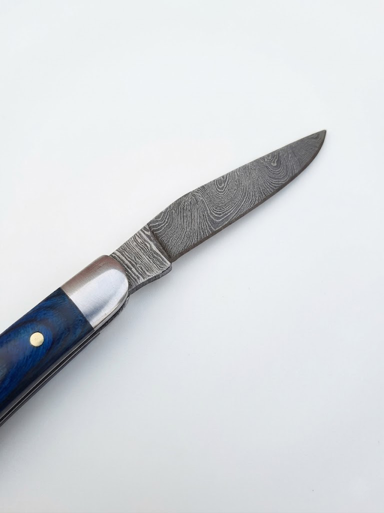 The blade, forged from premium Damascus steel, showcases intricate flowing patterns that make each piece uniquely beautiful. With a hardness rating of 55–58 HRC, it delivers reliable sharpness and durability despite its compact form.