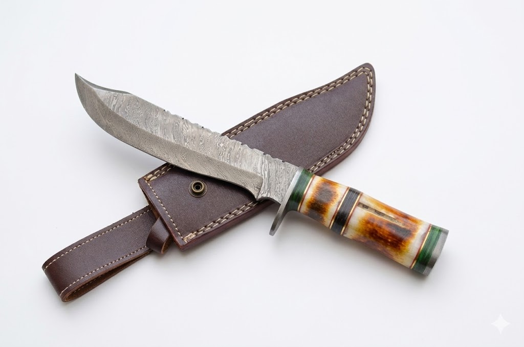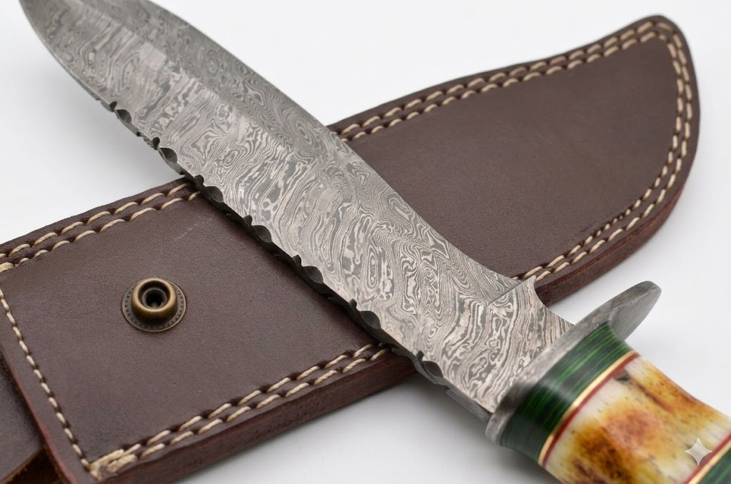 Steel Bowie Fire Pattern Damascus Knife & Hand-Stitched Leather Sheath