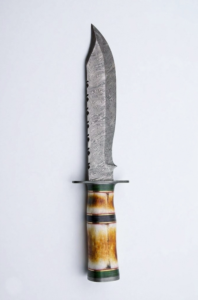 Elevate your collection or outdoor gear with our Steel Bowie Fire Pattern Damascus Knife . Forged from multiple layers of high-carbon steel, this blade is more than just a tool—it’s a striking piece of functional craftsmanship. Each knife features the iconic flowing Damascus patterns such as “ladder” or “raindrop,” making every blade truly one of a kind.