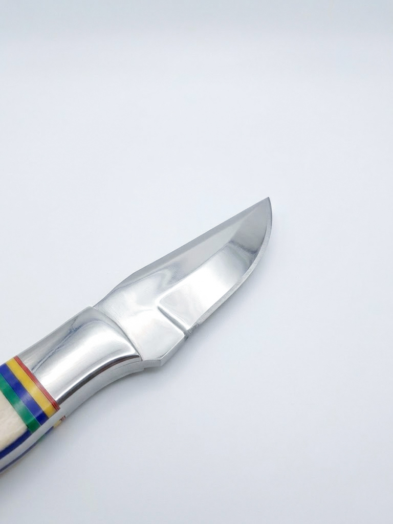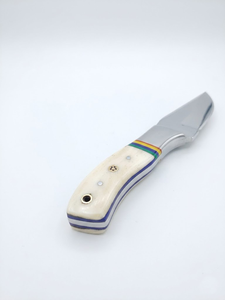 The 4-inch handle is a true statement of artistry, meticulously crafted from polished natural bone and accented with a solid steel bolster for enhanced strength. At its core, finely detailed brass and fiber spacers create a striking visual contrast, elevating the knife into a piece of functional art. Each handle carries its own unique character, making every piece one of a kind.